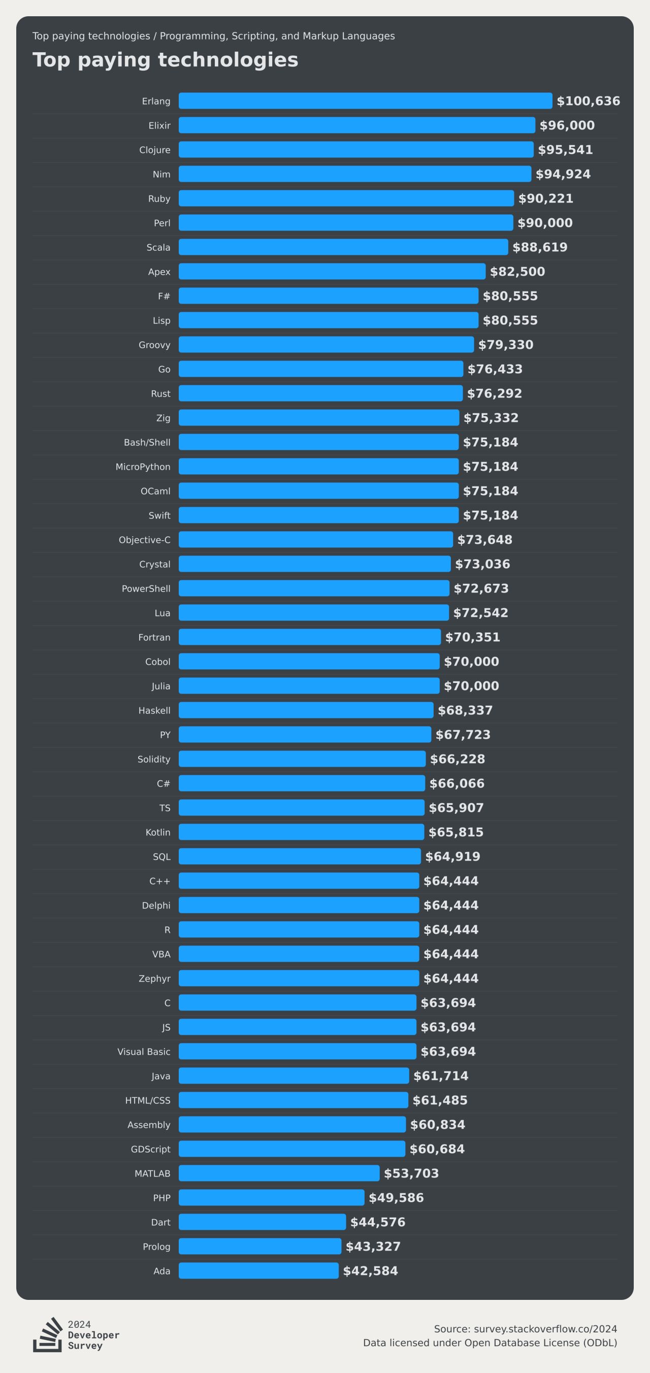 “Top paying” for me means that with Elixir and Phoenix LiveView, I can single-handedly implement things that I’d otherwise pay a fortune for one backend developer (PHP or JavaScript) and one frontend developer (React, NextJS, etc.) to do, while also playing project manager / product manager / cat herder between these two minds that constantly have to renegotiate JSON response schemas 🤦